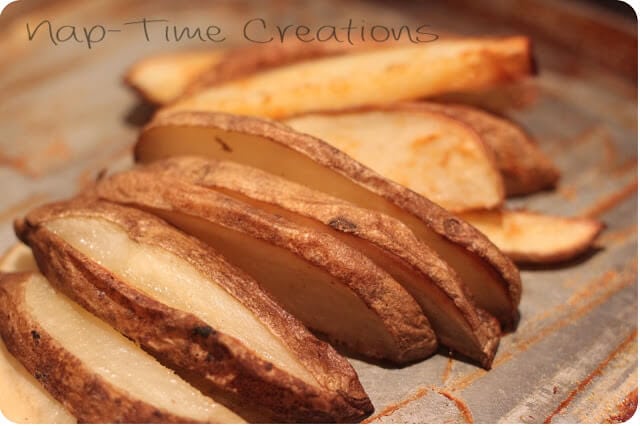 Take four large baking potatoes and cut it in half the long way. Cut each half into thin slices (about 1/4 inch) put all the slices in a bowl, toss with 3 TBS olive oil, a dash of salt, pepper, and paprika. YUM!