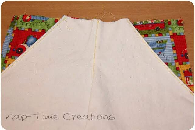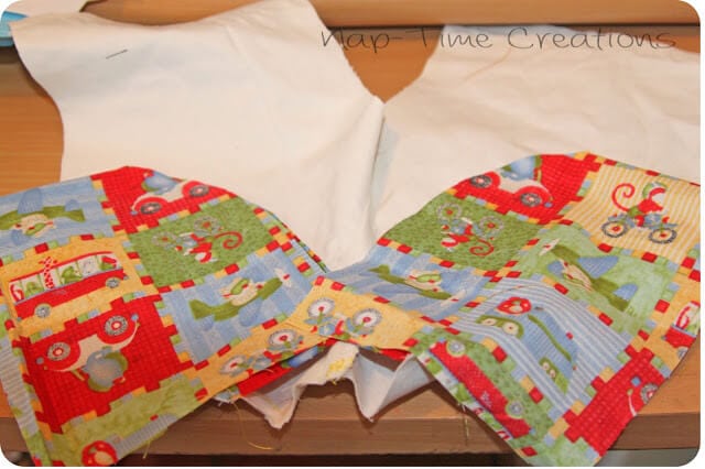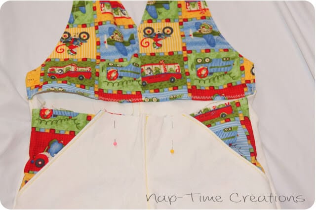 4. Sew pocket together, right sides in. One corner cut to one full pocket. Make sure the two corner cuts are facing opposite directions. So you two pockets will face out. For more details at putting in a pocket see this Pocket Shorts post. Basically the same shorts without an overall bib. Pin top waist to pockets to keep in place.