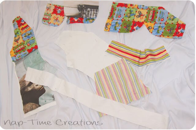 - Print out and tape the pattern pieces. Match the symbols for the pieces that cover multiple pages. Find a fabric for the overalls and a colorful thinner material for the lining. I used a light canvas type for the outside and a normal cotton print for the lining. You should have the following pieces:
