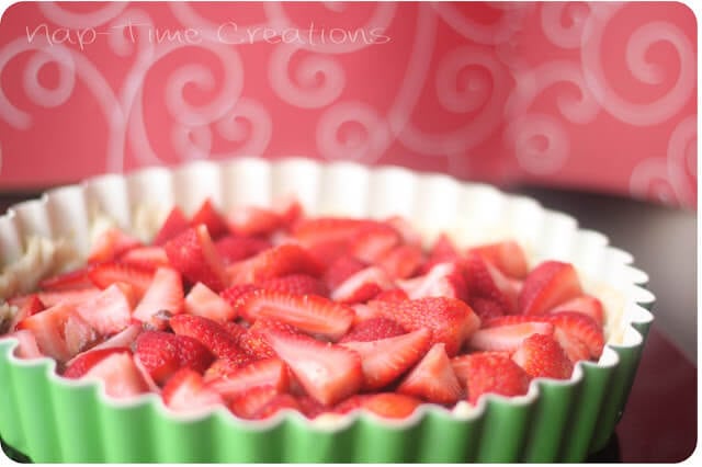 Cut up the strawberries and arrange on top. I went for the totally-random look, but you could do a really pretty design as well.