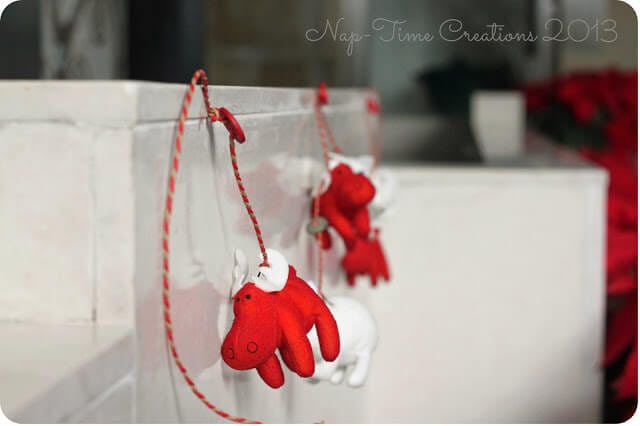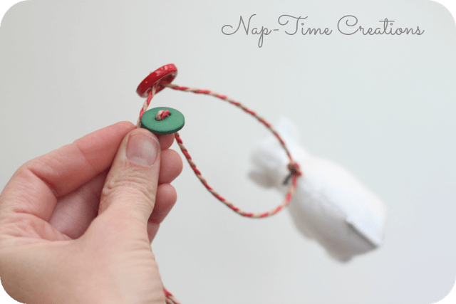 I used red and tan cord {also from IKEA} to string the animals together and added buttons in-between for more color.