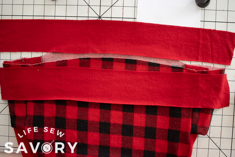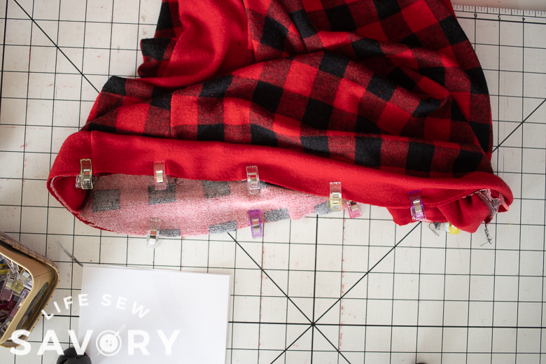 Start by hemming the top of the pockets. Fold back 3/4″ and hem with stretch stitch or coverstitch machine.