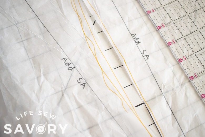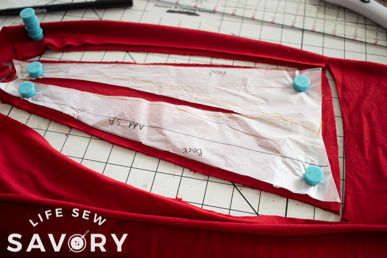 Here are my two lines. I also made sure to mark that I needed to add seam allowance when cutting the fabric. You will see in the second photo that I move my line more outward. I realized the panel was too small for a hand to fit. {aren’t you glad I test all these things for you – haha}