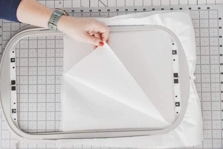 To prep the hoop I like to place a piece of tear away under a piece of adhesive stabilizer. Hoop just the stabilizer.