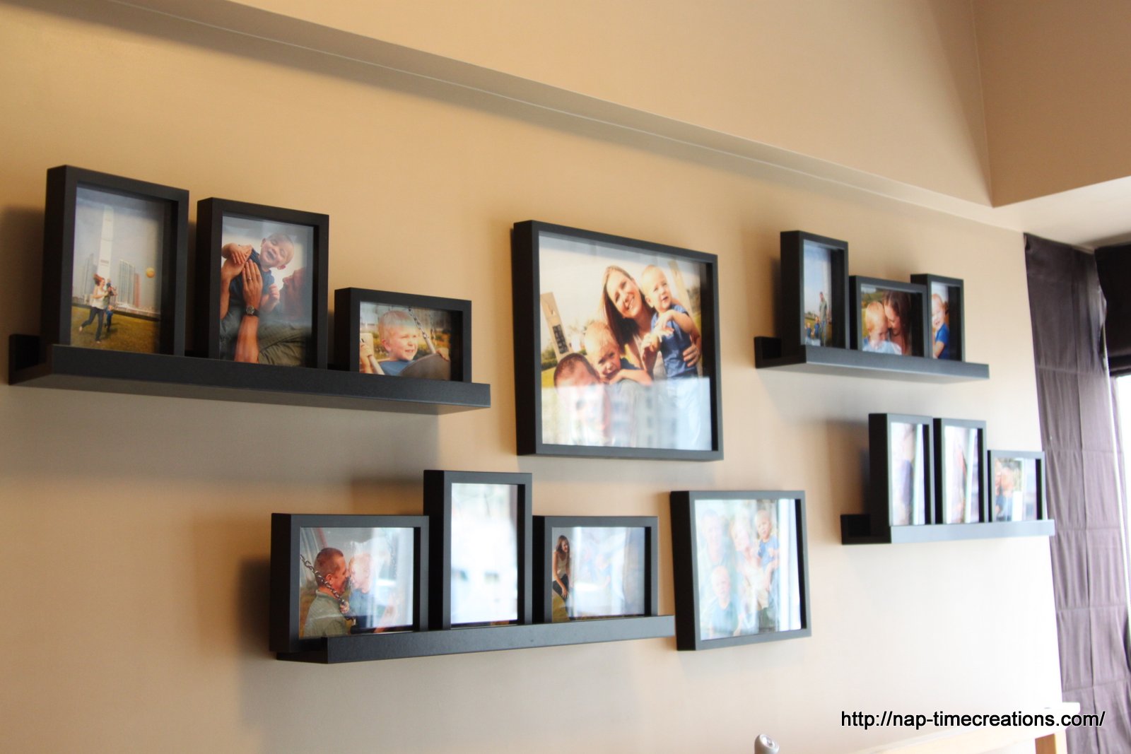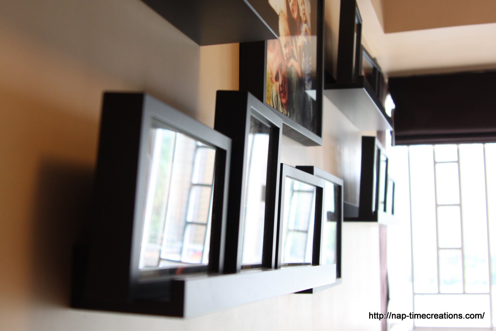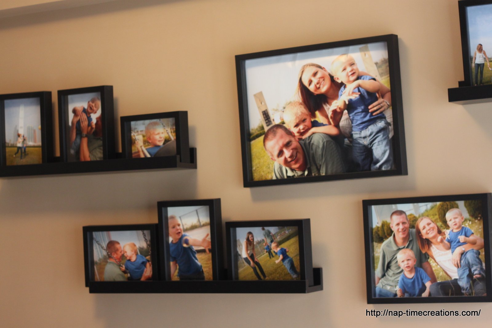 We hung the 8×10 and 11×14 directly to the wall and then installed four of these shelves from IKEA.