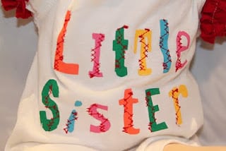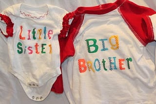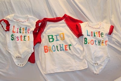 I used fabric paint and freezer paper to do stenciling for the first time. I LOVE it! I can’t wait to find more projects to stencil! I embellished the paint with some stitches on my machine. I think it would have been cuter hand stitched, but I just wanted to get finished. The big brother shirt I made from scratch using two old t-shirts. And the onsies were white new-born size ones I already had.