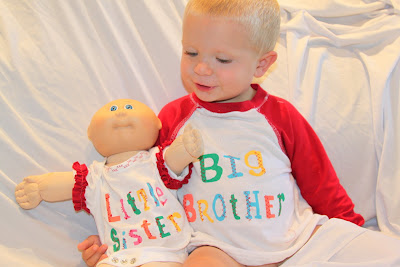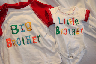 I used fabric paint and freezer paper to do stenciling for the first time. I LOVE it! I can’t wait to find more projects to stencil! I embellished the paint with some stitches on my machine. I think it would have been cuter hand stitched, but I just wanted to get finished. The big brother shirt I made from scratch using two old t-shirts. And the onsies were white new-born size ones I already had.