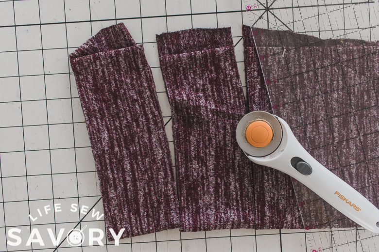 Cut your bands about 3″ wide. {See the video} You will need two joined together. So sew the short ends together to begin.