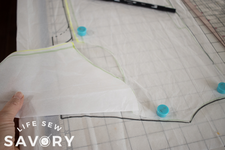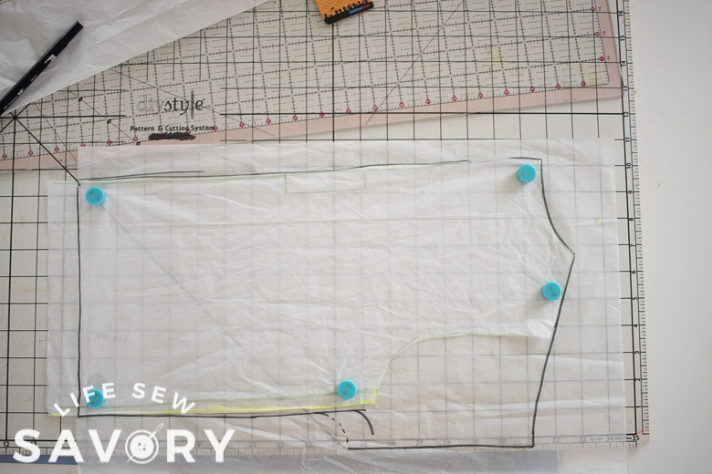 The second cardigan has a looser drop shoulder version. This is the same Boys T-shirt pattern base. You can also start with any looser fit shirt you have. I traced and cut out the original version, then added a bit to the design {seen in black lines}. I lowered the arm hole by 1 inch and curved it out. I also extended the shoulder, then draw a line down to the underarm. This will create the drop shoulder.