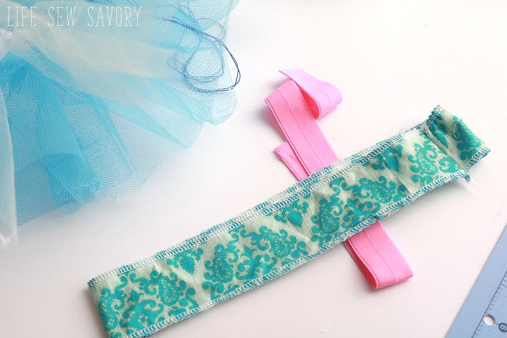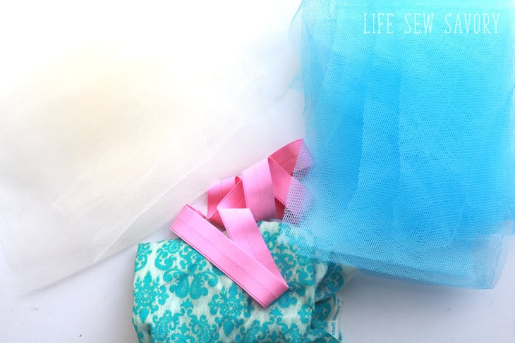 OK, let’s get started. You will need FOE elastic, Tulle {1 -2 yards depending on colors and size} and some scraps of fabric.