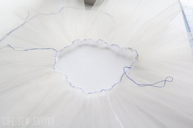 Cut the tulle the width of the fabric and the height you want your skirt to be. So if you want your skirt 10″ I would cut stripes of tulle 10″ wide. Sew at least 3 of these together to form a HUGE circle. You want this to be very gathered so if making a classic tutu for a larger girl you may want 4-5 sewn together. Repeat with a second color/layer if desired. You can make one layer more full than another as well. I made the blue very full {3 fabric widths} and the white layer less full {2 fabric lengths}.