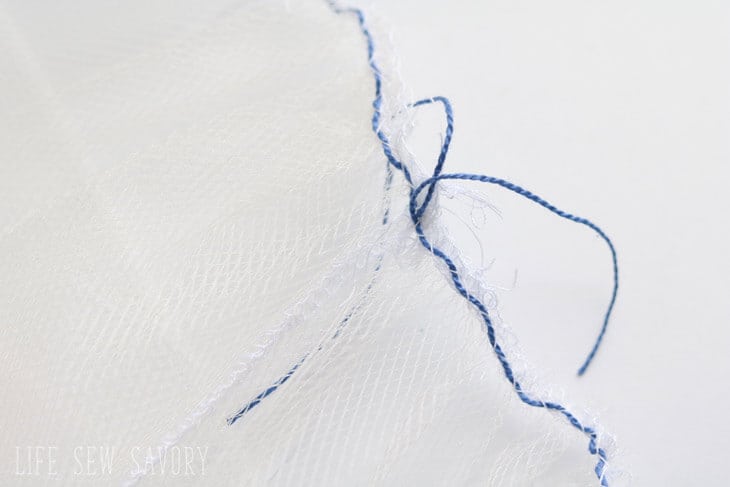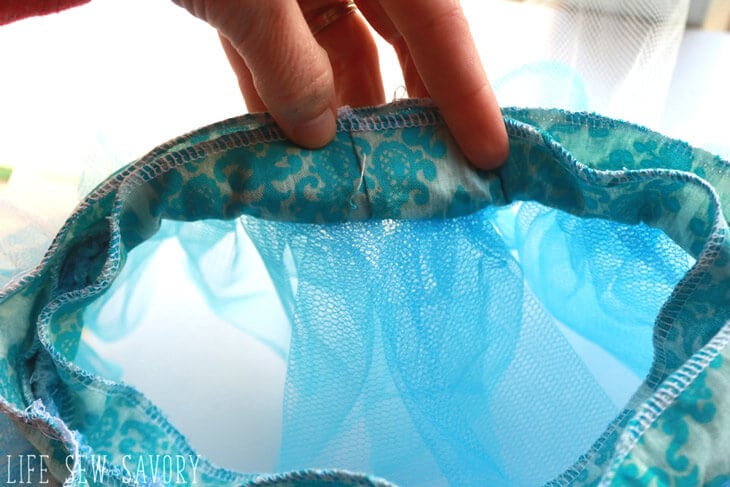 Pin one fabric circle on each side of the top of the tulle. You are sandwiching the tulle between the right sides of the fabric. Sew with just a straight stitch 1/4″ seam allowance.