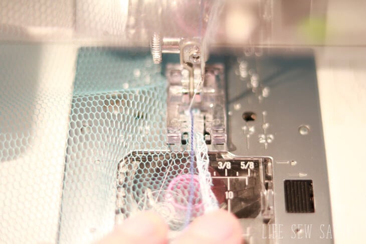 Now to gather this monster. I like to use the thread method of gathering when I have SO much fabric to gather. Take a string and zig zag OVER it around the top of the tulle. DO NOT sew the string, just sew over it. I also finished this top edge of my tulle with the serger if you have.