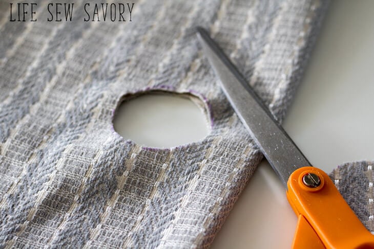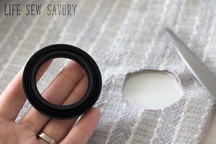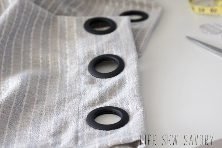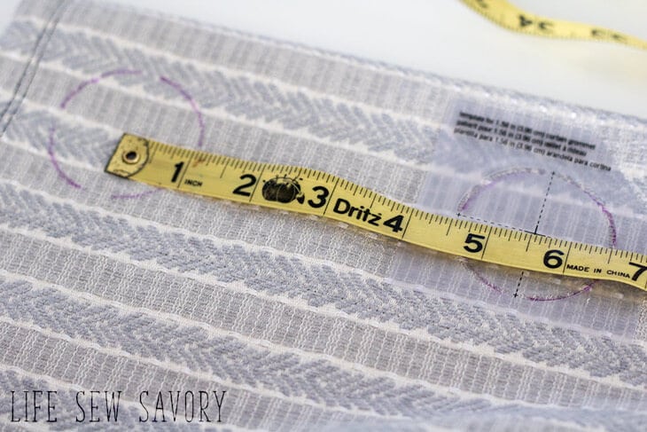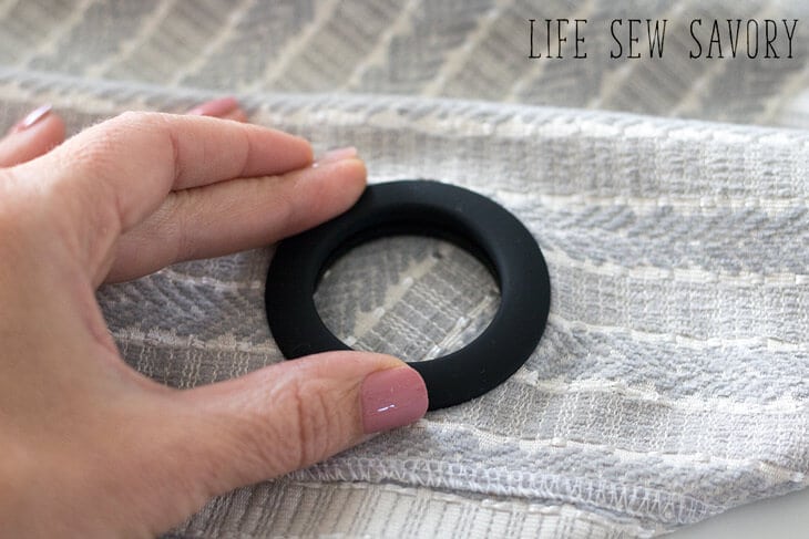Based on the width of your fabric you will space the grommets evenly. Mine where 5.5″ from circle center to circle center.