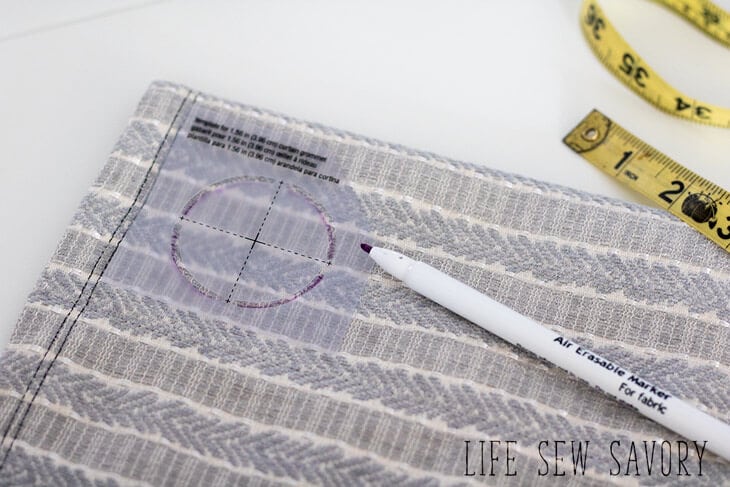 Start about 1″ from the hemmed edge and use the included guide to trace circles on the fabric.