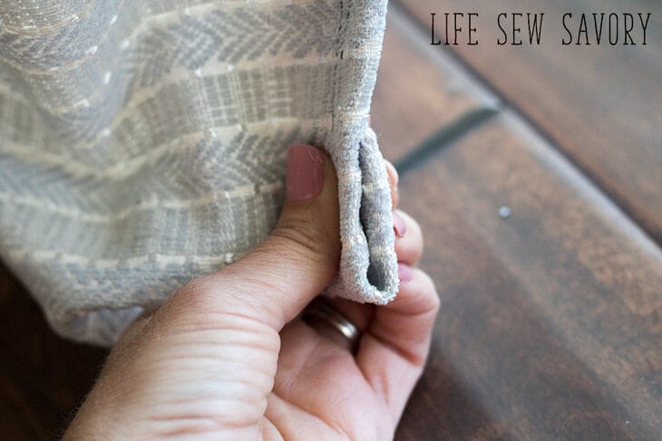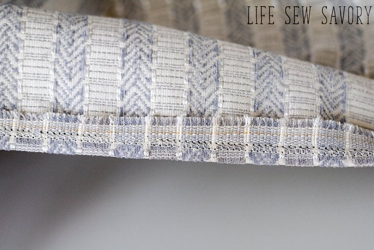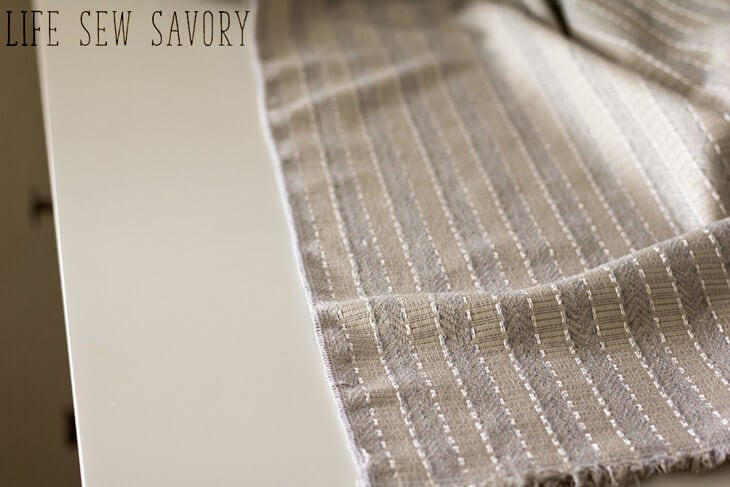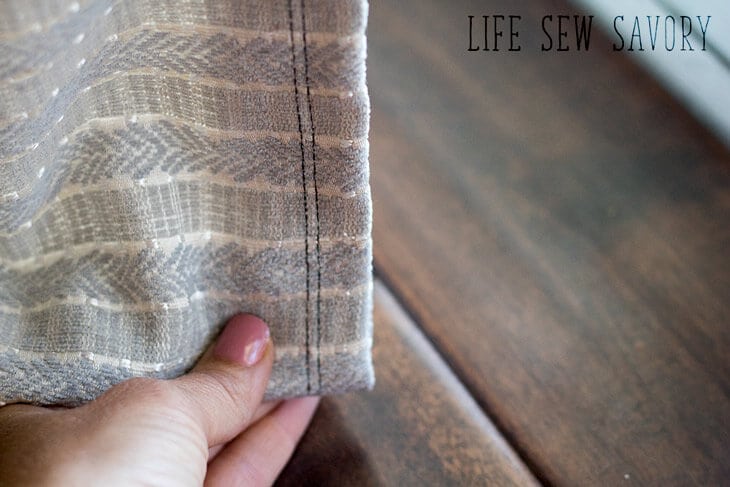 I started by finishing the top and bottom of each panel. {the sides are the already finished selvedge edge} You can finish the top and bottom with a serger or fold under 1/4″ hem.