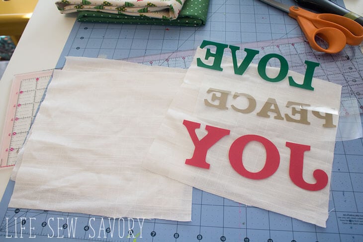 OK! Let’s make some fun Christmas throw pillows to add color and decor to your holiday home. I started with 8 x 8 ” white squares. You can paint or add vinyl lettering. You will also need 1 yard Christmas fabric {can be a combination of a couple fabrics} and a 18″ pillow form {or desired size.
