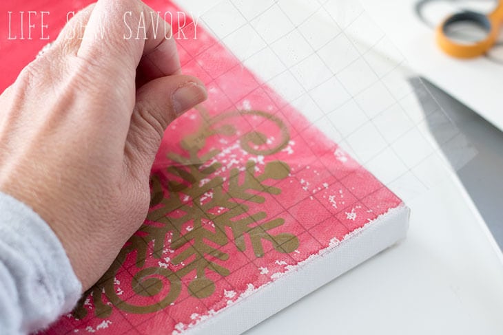 Peel of the backing and then position on the canvas. Rub again, then peel off the transfer tape.