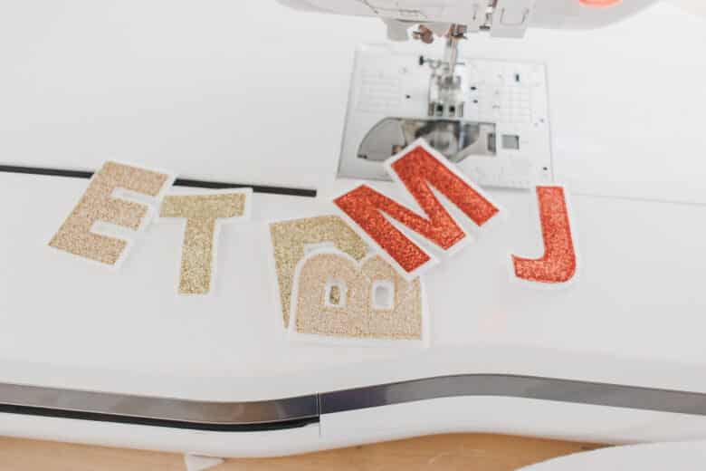 Cut white felt big enough to sew the glitter letters on. Or cut several small pieces of felt if needed. With a straight stitch and matching thread {try to match the glitter vinyl color} Stitch around the letters close to the vinyl edge.