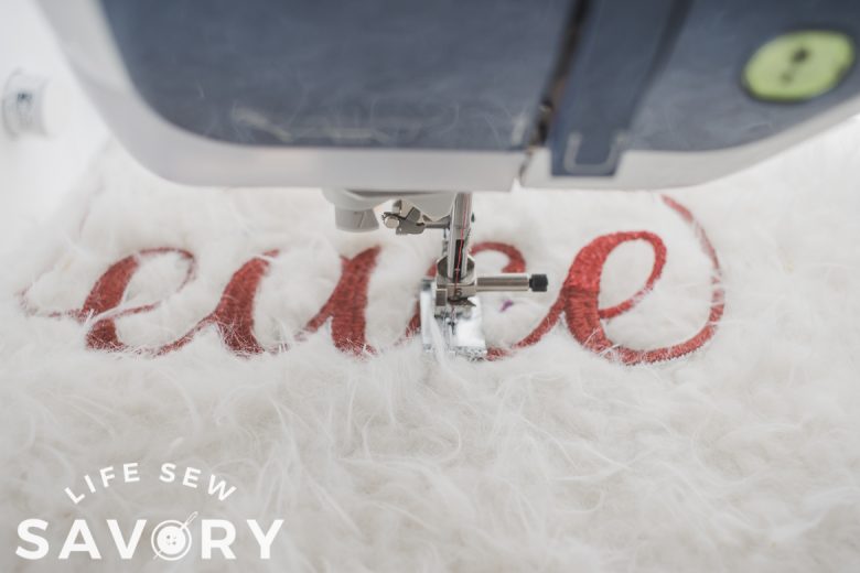 Now its time to sew. I ended up using a specialty foot. I used foot O if you have a Brother Machine. I think this is just a straight stitch foot, but it worked great for not getting caught up in the fur. I also used my fingers to keep the fur out of the way while sewing. I sewed around every letter twice, on each side of the stitching.