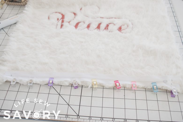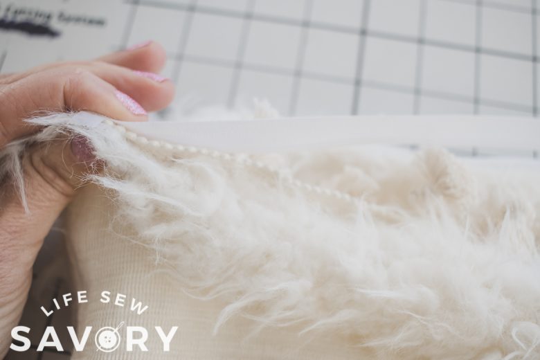 Turn pillow right side out. Double check that you have caught all the pom pom edging in the seam and both layers of fur. Open the zipper and put your pillow form inside.