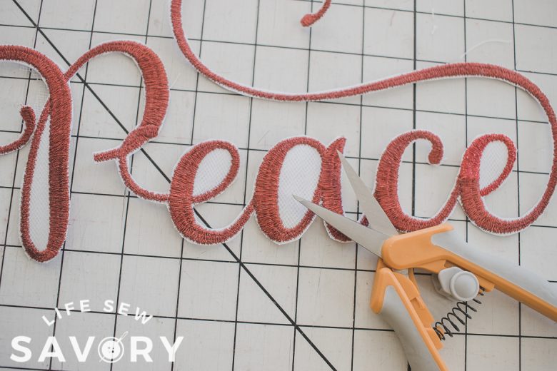 From there, trim around the design. Cut as close to the stitches as possible, without cutting the stitches. I used a small scissors for the inside pieces.