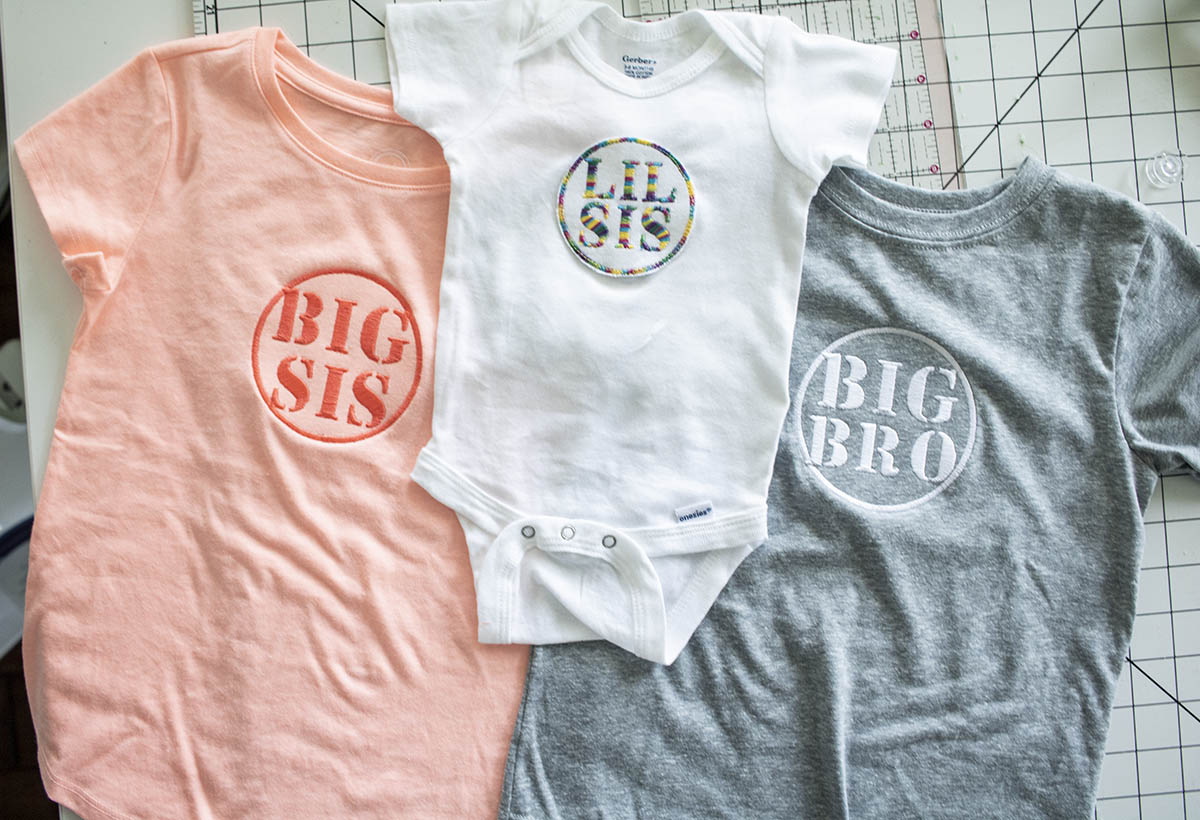 I think these shirt/onesie combinations make the best new baby gifts! You can create as many of the big sister/big brother shirts as you need for the older siblings, then make the new baby and adorable onesie. The siblings will fit into their shirts much longer than the baby, but those newborn photos are adorable with coordinating shirts.