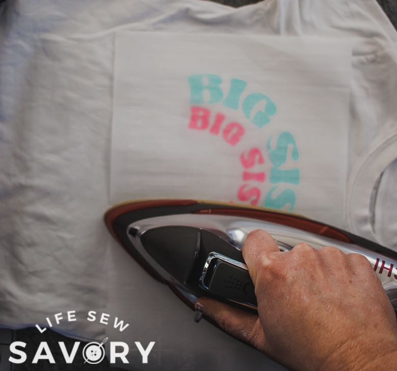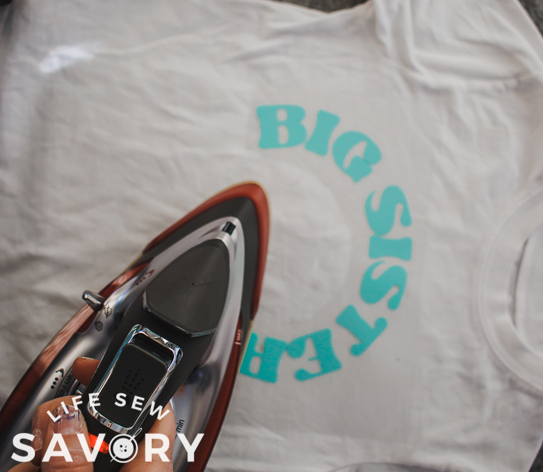 Start with the largest text and iron that in place. You can use a regular idon or a heat press. The two most important things to remember is that with either you need pressure and the highest heat your fabric can handle. When I use the iron I put a lot of pressure with my arm/whole body on the vinyl.