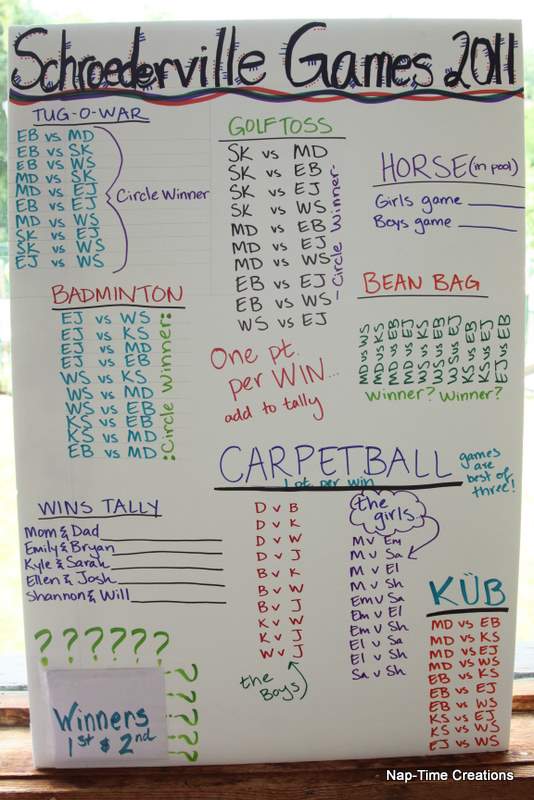 Since we’ve been a family of adult kids, we all gather back home in the summer for a weekend of super competitive games (at least we like to think we are hard core!) Its a great way to bring the whole family together and give us a common purpose. We spend the weekend together (not all off in separate activities) and have a blast along the way. My parents provide a cash prize for the winning couple, so we all get into it! Here are the games we play and a shot of our score sheet.