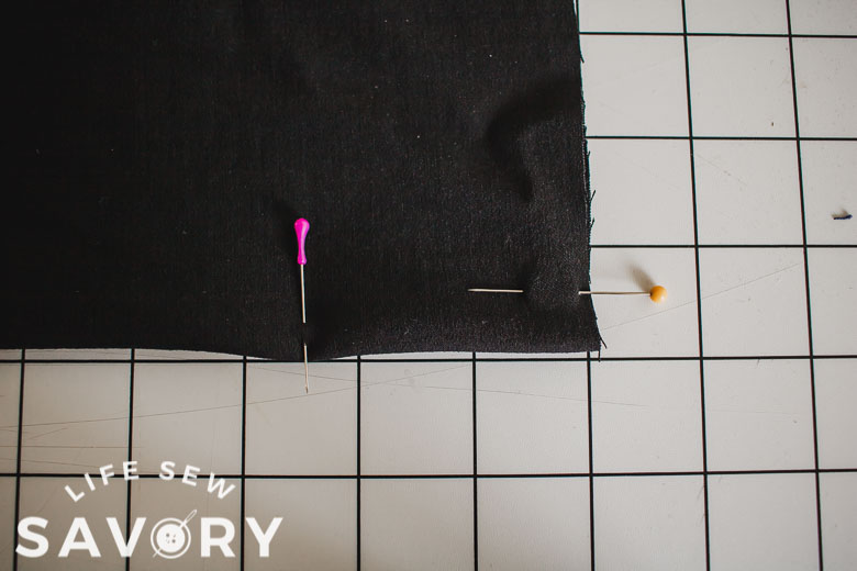With the raw edges of the fabric pointing UP, place the pocket just below the back pleat. Sew along the raw edge with a 1/4″ seam allowance.