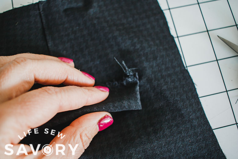 Fold the pocket UP towards the top of the back. Tuck in the sides and any raw edges you can still see. Make sure to pull the sides of the pocket to the sides of the back. You do not want this pocket to “gape” at the back.