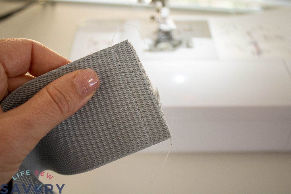 Sew with the elastic side up, keeping the fabric tucked under to attach. See how the fabric is sewed here to the back of the elastic. TIP: use a thread that will match the elastic so you don’t even see the stitches.