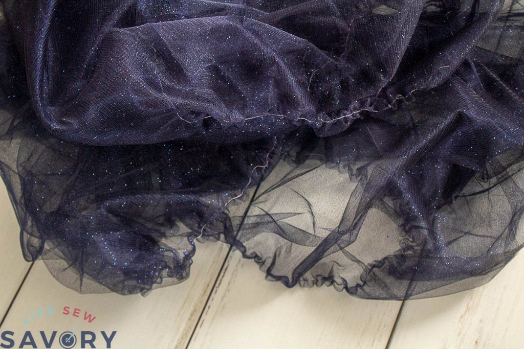 Place the two top edges of the skirt together. If you need to gather the tulle more do it now so the edges match. Baste the two layers together.