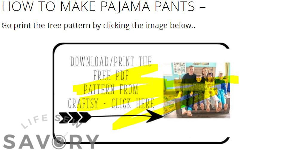 Older posts may have a text link OR a graphic that says click here. All posts have this link around two times. These types of links are in older patterns.