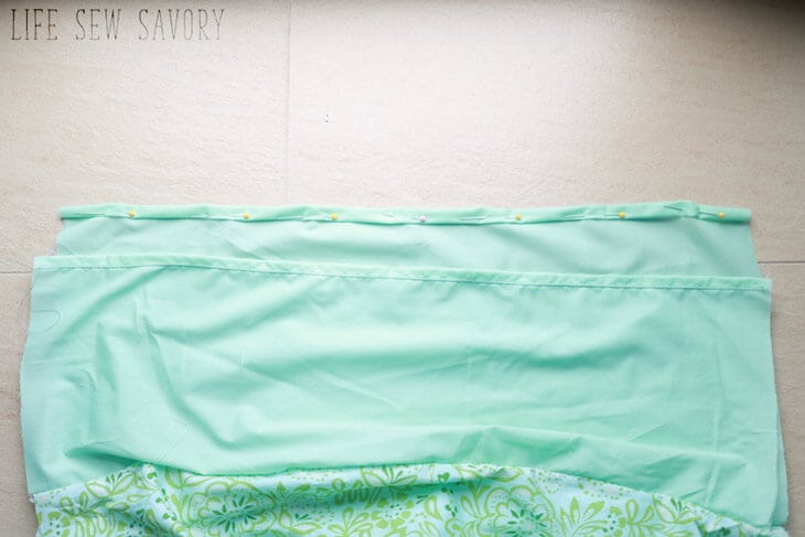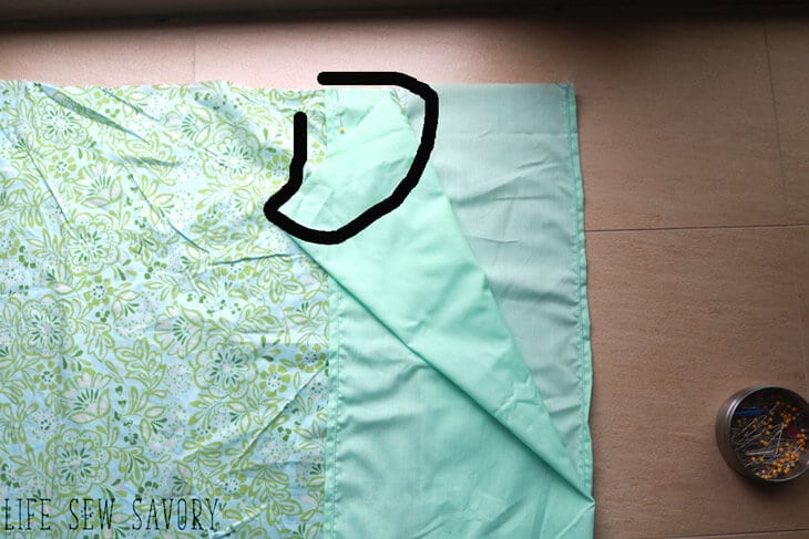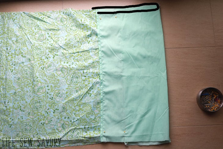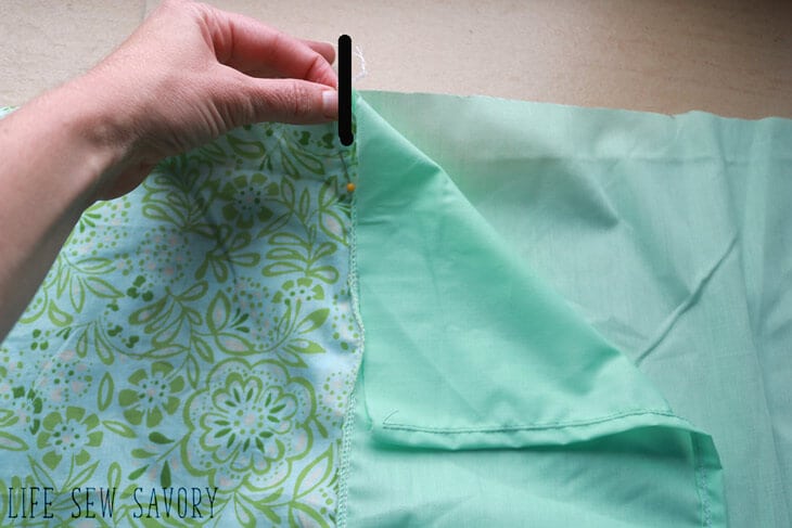 With right sides together, match the two seams where the solid meets the print. Pin on both side of the pillowcase.