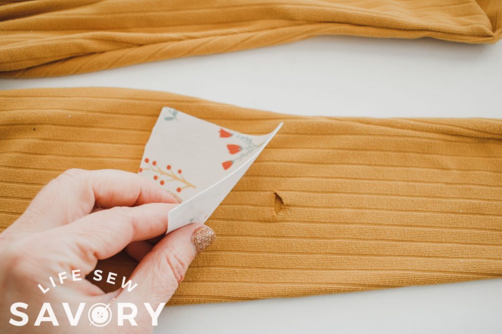 Ok! Let’s jump into this sewing tutorial! Grab your holey leggings and some fabric for patching. You will also need some fusible interfacing to reinforce the patch. I used knit fabric for my patch.