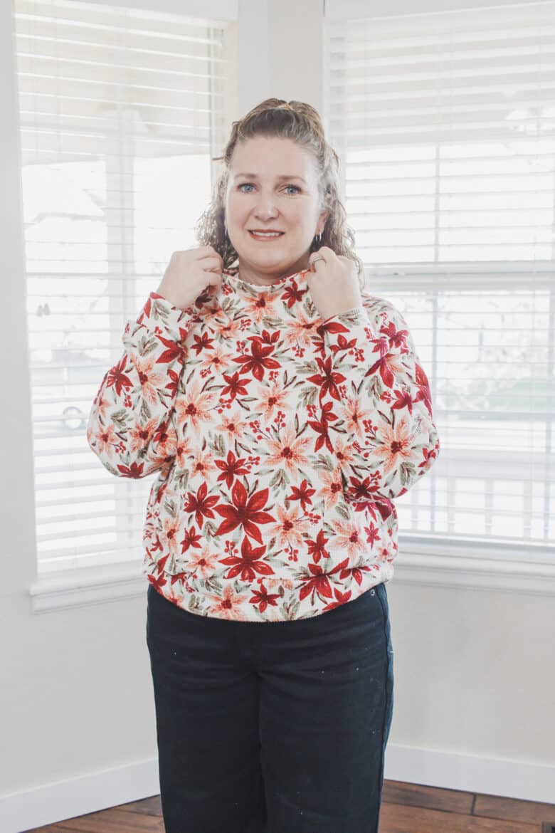 I will mention that this pattern is meant for more structed fabric, like sweatshirt fleece. I had all this cozy Christmas waffle, so I used that, but it probably would be best with a more structured fabric. If I were to make this again with the waffle, I would try a stabilizer in the neck to give it more structure. I don’t mind the soft, slouchy neck style, but the pattern was intended for it to stand up.