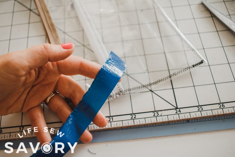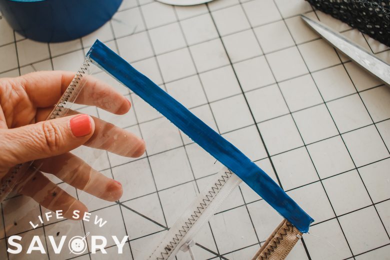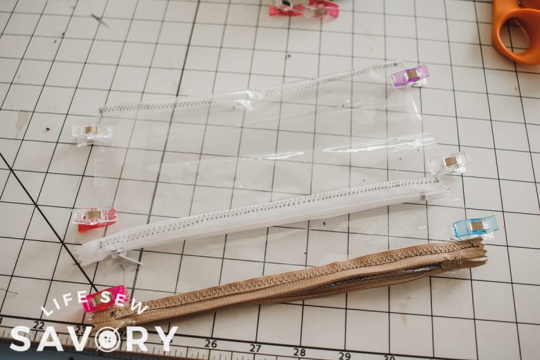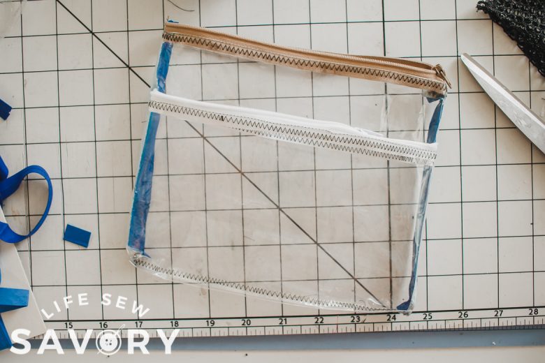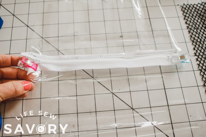 With right sides together, sew one side of the zipper to the top long edge of the pocket. Use a zipper foot and sewing machine. For the clear vinyl I used a straight stitch to sew, then fold the zipper back and top stitched with a zig zag to reinforce. I also folded and top stitched the mesh one back too.