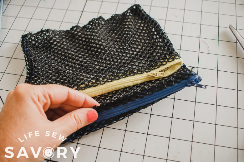I’ve listed what I did use as well as what I wish I had… I did end up ordering a 1/2 yard of the pricey plastic mesh and I’ll keep you posted on if it’s a good option. Here’s how this same pouch looks sewn from the new material.
