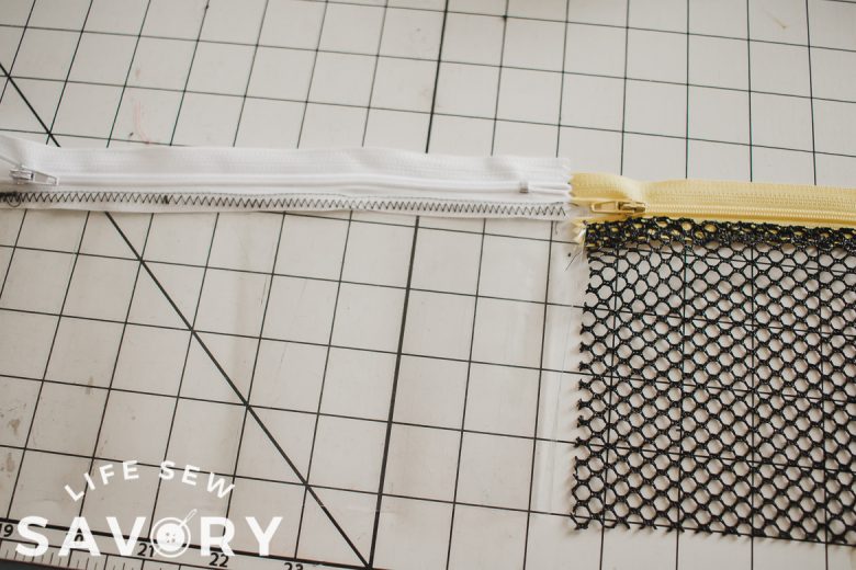 Start by gathering your fabric and zippers. Each case needs two zippers and I sewed both the mesh and vinyl at the same time. Both are slightly tricky to sew, but neither was super hard. The pencil pouch actually comes together quite quickly.