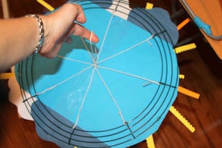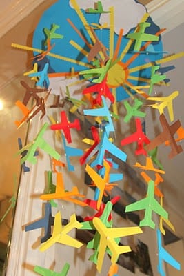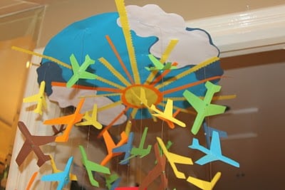 I’ve been working for a few weeks now on this project and am pleased to finally be able to post it! My first big project with two kids! After having a second boy, I’ve decided to redo the nursery in a transportation theme, and this is the first step. I loosely followed the ideas found in THIS tutorial for the Pottery Barn Butterfly Mobile. Instead of leaving the frame exposed, I decided to create a sky scene so I could wire the top however I needed. I didn’t have a plane punch, but I printed a plane outline off the computer in three sizes to trace and cut out.
