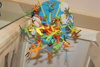 I’ve been working for a few weeks now on this project and am pleased to finally be able to post it! My first big project with two kids! After having a second boy, I’ve decided to redo the nursery in a transportation theme, and this is the first step. I loosely followed the ideas found in THIS tutorial for the Pottery Barn Butterfly Mobile. Instead of leaving the frame exposed, I decided to create a sky scene so I could wire the top however I needed. I didn’t have a plane punch, but I printed a plane outline off the computer in three sizes to trace and cut out.