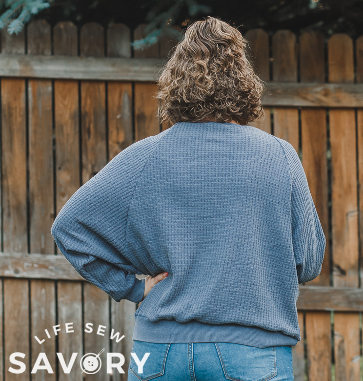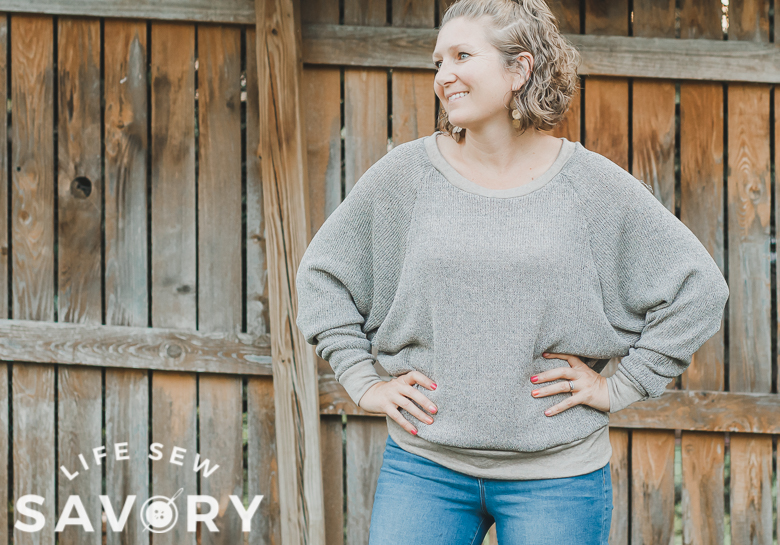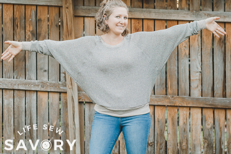 I sewed this entire top with JUST MY SERGER {can I get a Hallelujah???} No hems or top-stitching {yes please!} If you don’t have a serger make sure to use a good knit stitch or zig-zag. I’m honestly not sure how it would work with a loose sweater knit, but a sewing machine should be fine for French terry or Waffle.