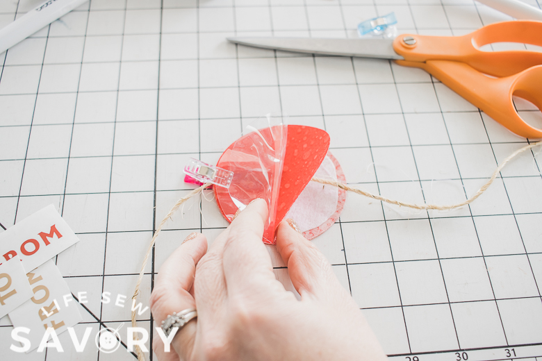 Now it’s finally time to put all this prep work into creating. Layer the shapes with the bottom being right side down, then add a tie {loop or long}, then add another fabric right side up, then the clear vinyl on top. Clip around to hold in place.