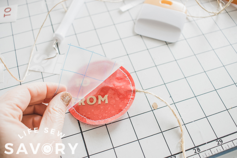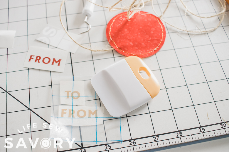 Press the letters to the vinyl, then remove the transfer tape. Your tags are now ready for names and gifts.