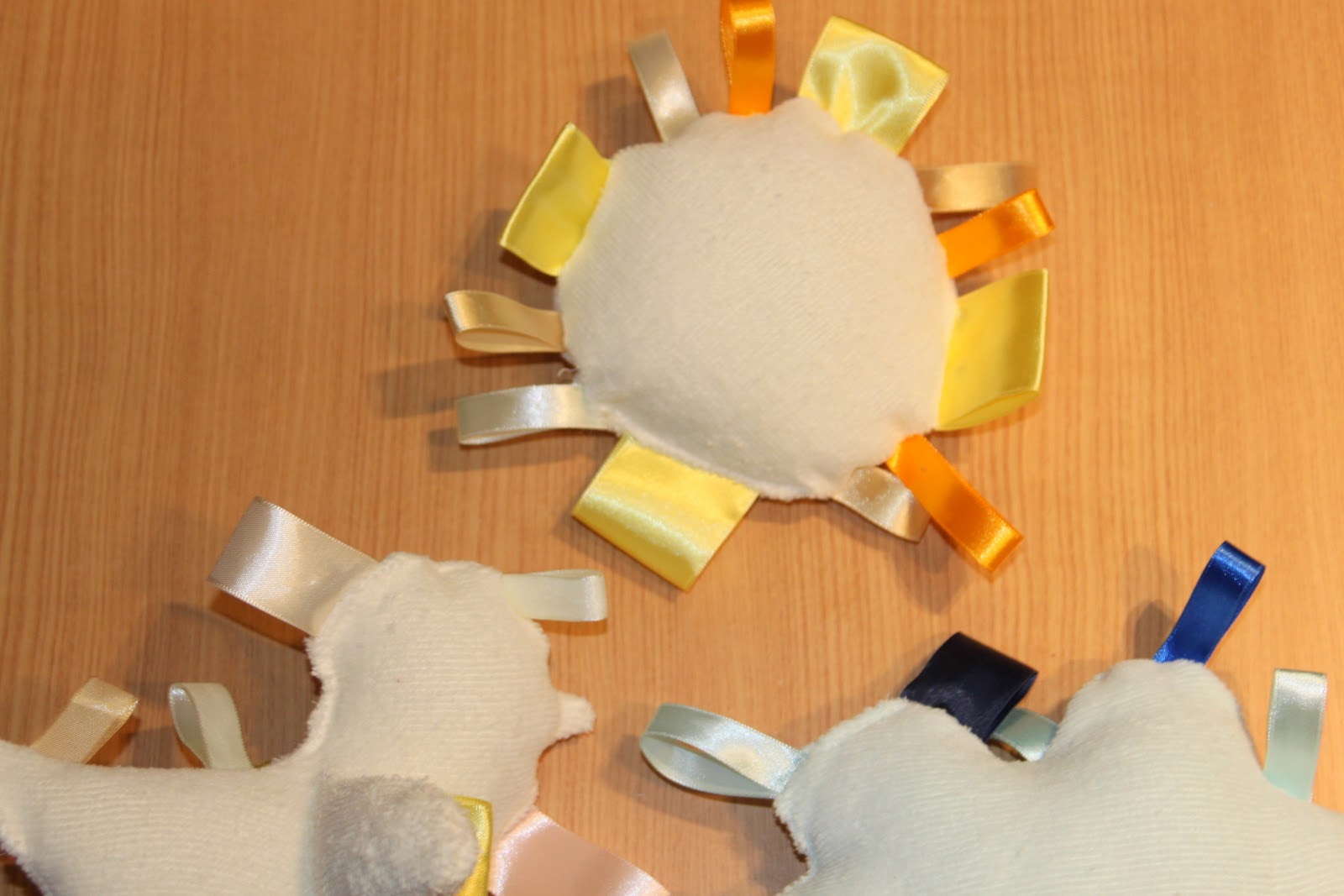 I’ve seen these around and always thought it would be a quick easy project. So when we were given some soft towels, I decided to make them into baby chew toys. I cute out the shapes (cloud, sun, bird) pinned the ribbons around, sewed most of the way around, stuffed the inside, and sewed the hole shut…. SO easy!