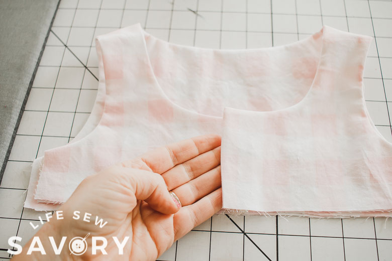 Turn each side of the front through the shoulder to turn right side out. You may need to use a small pointed object to help push through. I like to use a chop stick or knitting needle if needle. Press the top so that all the seams are flat.
