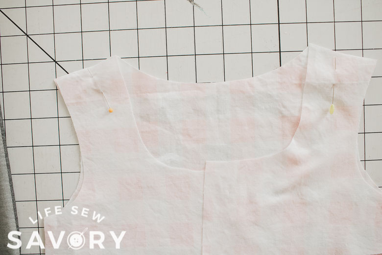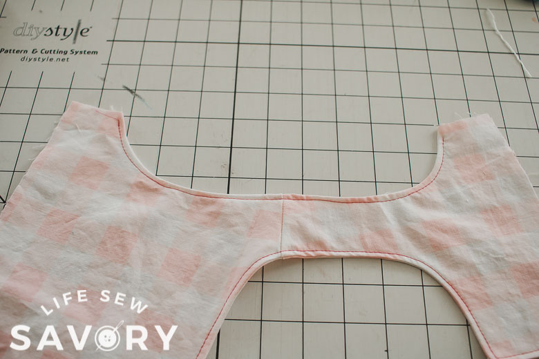 Place the two bodices together with right sides touching. You will sew the neckline and arm openings. See the clips below for edges to sew. Sew with a serger or if you use a sewing machine make sure you clip the curves before turning right side out.