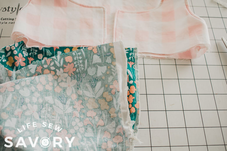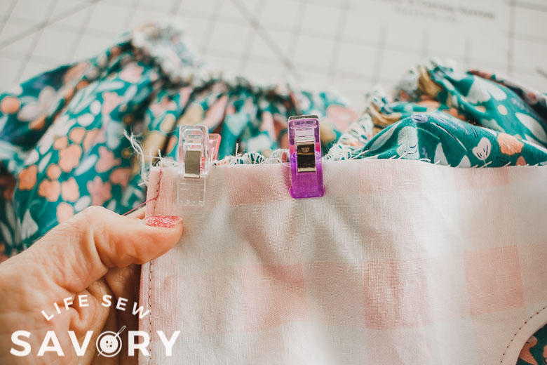 Line up the front edges of the top and skirt with right sides together and pin or clip around to the other side of the top. NOTE: if I was doing this again I would have finished the bottom of the tank before sewing on the skirt. You can finish with a serger or zig-zag on your sewing machine.