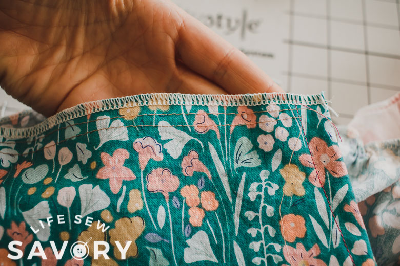 Finish the bottom of the skirt with a serger or zig-zag on your sewing machine. Then turn up a 3/4″ hem and stitch.
